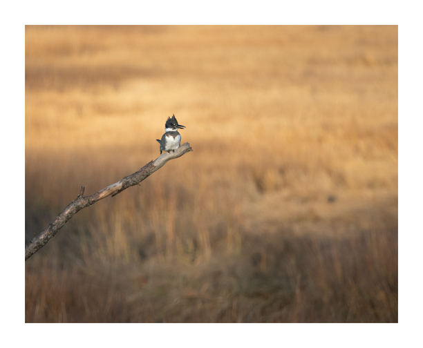 Belted Kingfishers can be found year-round in southern Maine. Males, like this individual, have a dark blue collar. Females have the dark blue collar, and a rusty orange band below it. Belted Kingfishers, as their name suggests, mostly eat fish. Occasionally however, they eat foods like amphibians, young birds of other species, and berries.